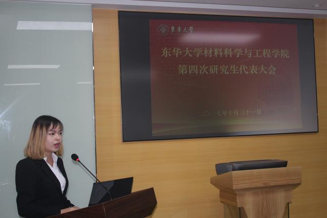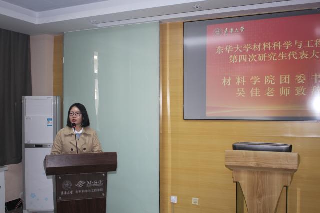 材料学院团委书记吴佳首先对研代会的召开表示祝贺,她指出,研究生代表大会的顺利召开标志着材料学院民主建设迈上了一个新的台阶,对于推进研究生的自我管理、自我教育、自我服务和自我监督具有重要实践意义。她指出广大研究生要以习总书记勤学、修德、明辨、笃实的八字要求为指导,树立起正确的人生观、价值观、世界观,接棒前人开创的伟大事业,在新的历史征程上推动中国特色社会主义事业继续勇往直前。