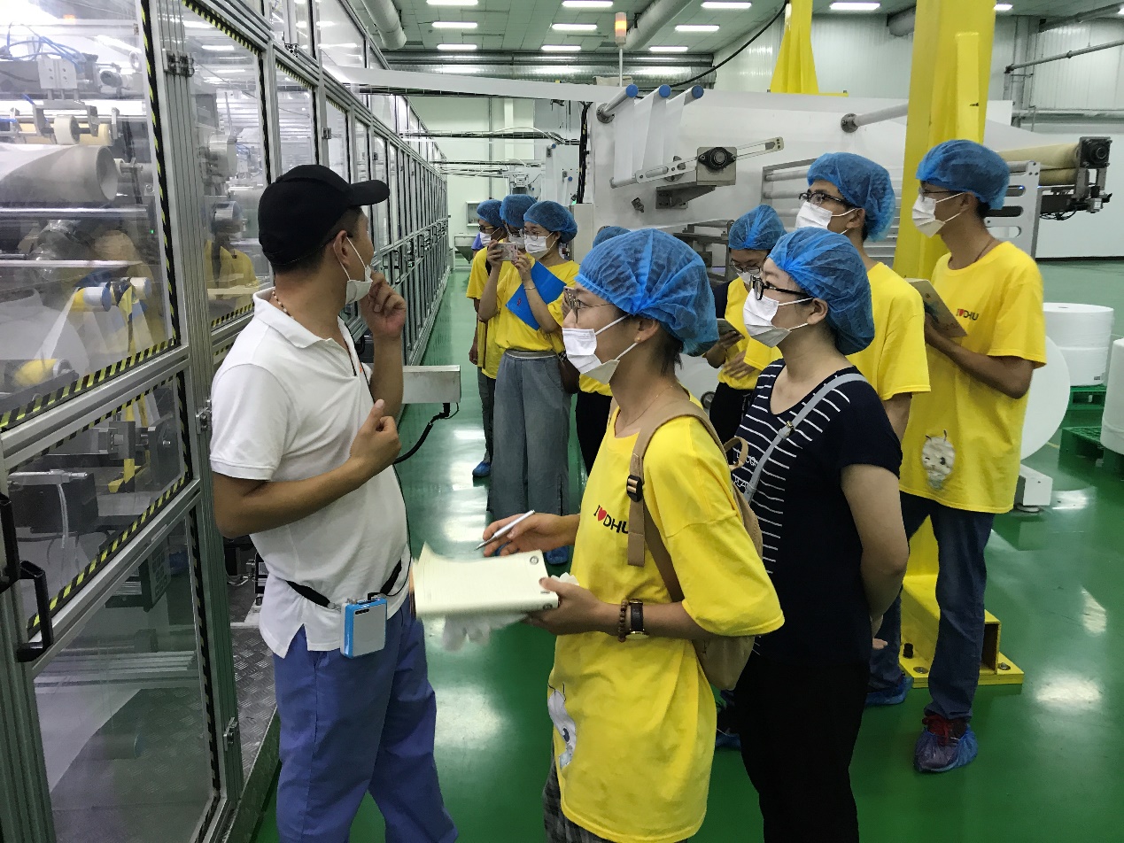 实践团深入亚洲最大的单体纸尿裤生产工厂——山东爸爸的选择健康科技有限公司的研发、生产工厂,以了解“企业文化、工厂构造”为基础,结合生产线和产业链,相继前往了“原材料检测实验室”、“原材料存储车间”、“材料合成车间”、“产品生产车间”、“成品在线品检中心”、“仓储物流车间”,对企业的后台研发与生产系统进行了调研。