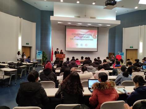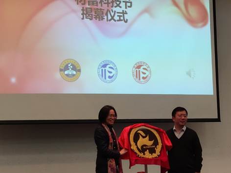 随后,朱美芳教授与步文博教授一同为本次开幕式揭幕。会标中一只火烈鸟在镜月湖前腾空而起,一飞冲天,象征材料学院不拘一格、敢于创新,力争在材料研究领域再上新台阶的学术追求。