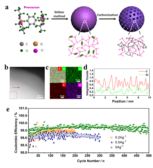 针对这一问题,研究团队选取苯基桥联的有机硅前驱体,采用溶胶-凝胶法和高温煅烧两步反应,制备出一种新的多孔硅基复合负极(ASD-SiOC)。由于前驱体中碳源与Si-O-Si骨架为分子尺度下的复合,所制备的ASD-SiOC负极可以实现碳元素的亚纳米尺度分布。电化学性能测试表明,这种负极材料表现出优异地循环稳定性和结构稳定性。在0.2A g-1的电流密度下,第2圈库伦效率为95.4%,从第2圈到第200圈的平均库伦效率为99.3%。在5A g-1的大电流密度下,从第11圈到第500圈的平均库伦效率为99.8%。