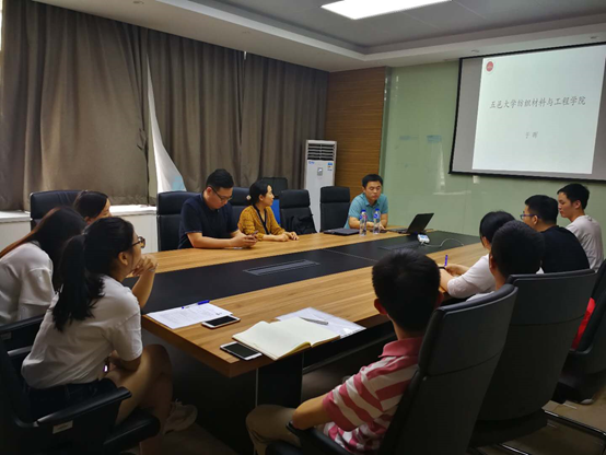 2019年6月17日,五邑大学来我校新葡的京集团35222vip在五号学院楼c322会议室进行教育交流与招聘宣讲。五邑大学材料学院院长于晖教授和新葡的京集团35222vip材料学院党委副书记丁明利、研究生辅导员郝艳萍和部分材料、纺织、化工博士毕业生出席了活动。