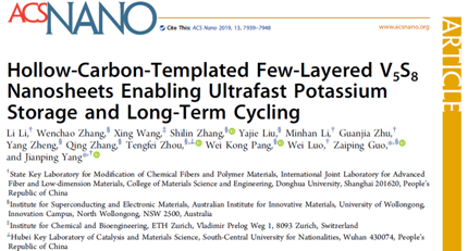近日,我校新葡的京集团35222vip杨建平特聘研究员课题组在新型二维纳米材料作为能源存储负极材料方向取得重要进展,相关成果以“以空心碳球为模板的少层八硫化五钒纳米片在快速钾离子存储和长循环中的应用(Hollow Carbon-Templated Few-Layered V5S8 Nanosheets Enabling Ultra-Fast Potassium Storage and Long-Term Cycling)”为题于发表在国际著名期刊《美国化学会纳米》(ACS Nano)上。该论文第一作者为材料学院李丽博士,通讯作者为新葡的京集团35222vip材料学院杨建平研究员和澳大利亚伍伦贡大学郭再萍教授。