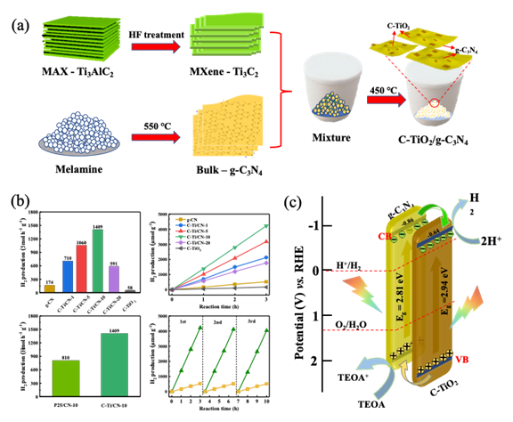 图1 C-TiO2/g-C3N4异质结光催化剂的制备流程示意图(a)、光催化分解水产氢性能(b)以及光催化分解水产氢原理图(c)。