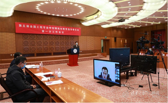2020年3月18日下午,第五届全国工程专业学位研究生教育指导委员会(以下简称“工程教指委”)第一次工作会议在清华大学主楼接待厅举行。会上宣布了第五届工程教指委委员名单,清华大学校长邱勇出席并续任主任委员。教育部学位管理与研究生教育司司长、国务院学位委员会办公室副主任洪大用,第四届工程教指委副主任委员、清华大学副校长杨斌等出席会议。身处全国各地的37名第五届工程教指委委员在线参加会议。第五届工程教指委秘书长、清华大学研究生院院长周杰主持会议。