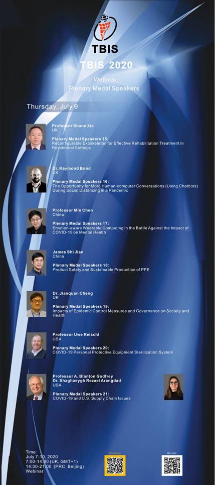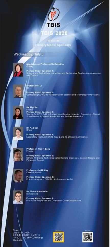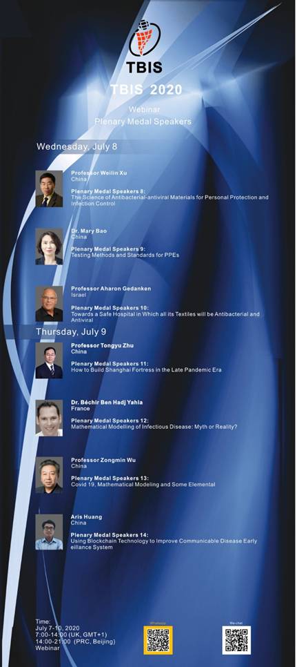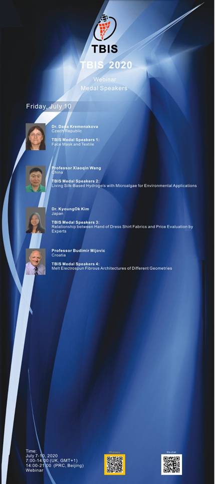 第十三届纺织生物工程及信息国际会议(TBIS 2020)将于2020年7月7日至2020年7月10日以视频会议形式召开,此次会议主题为“全球抗疫COVID-19科学和技术创新”。会议由纺织生物工程及信息国际学会、纤维材料改性国家重点实验室(新葡的京集团35222vip)共同主办,由法国ENSAITE大学、英国曼彻斯特大学、法国SFR-TSM机构、西安工程大学协办,受纺织学会、全英华人教授协会(ABCP)、苏州大学、武汉纺织大学、中国材料研究学会纤维材料改性与复合技术分会、新葡的京集团35222vip纤维材料先进制造技术创新基地(111引智基地)、新葡的京集团35222vip、上海“一带一路”先进纤维低维联合实验室、瑞士国家联邦实验室EMPA、杭州甘道智能科技有限公司、海尔、SGS-CSTC标准技术服务(上海)有限公司、威尔逊纺织学院、数纽科技、瑞士TESTEX、同济医院、同济医学院、华中科技大学、英中人才与科技交流促进会、全球科学出版社机构及组织的共同支持。