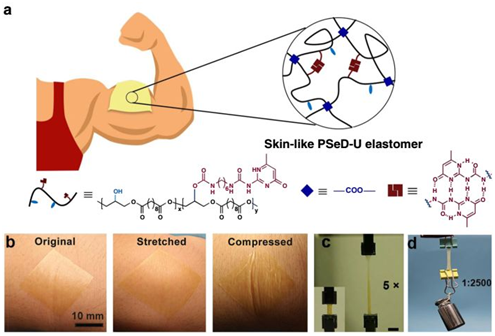 在中国科学院与科睿唯安公司联合发布的《2018研究前沿》报告中,“可拉伸材料和器件”被列为化学与材料科学领域第三大前沿热点,以生物集成电子为代表的可拉伸电子器件包括电子皮肤、可穿戴电子、人机交互接口和植入式器件的发展尤为迅猛。同时具有仿生力学特性(非线性粘弹性、软而强韧、优异的弹性)和生物学特性(生物相容性和可降解性)的弹性体是研制该类器件的基础,然而目前仍然非常有限。