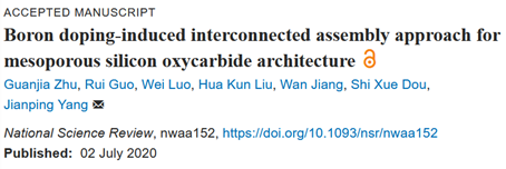 近日,我校材料学院杨建平研究员和江莞教授研究团队在纳米颗粒组装领域取得重要进展,相关成果以《硼掺杂诱导互联组装方法构建介孔SiOC多级结构》(Boron doping-induced interconnected assembly approach for mesoporous silicon oxycarbidearchitecture, DOI: org/10.1093/nsr/nwaa152)为题,发表于中国科技期刊卓越行动计划领军期刊《国家科技评论》(National Science Review),该论文第一作者是材料学院17级博士生朱冠家,合作者包括澳大利亚伍伦贡大学刘华坤教授和窦世学教授,新葡的京集团35222vip罗维研究员、江莞教授和杨建平研究员,新葡的京集团35222vip为唯一通讯单位。