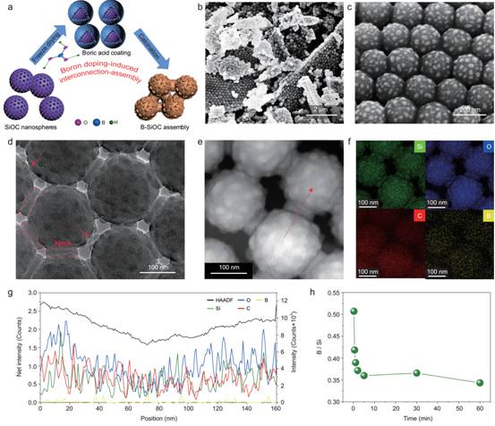 针对这一问题,研究团队开发了一种新的硼掺杂诱导互连组装的方法,以制备由周期性介孔有机硅衍生的SiOC纳米球为组装单元,所制得的硼掺杂SiOC(B-SiOC)组装体由表面粗糙、相互连接、强耦合的纳米球组成。进一步的研究发现原始纳米颗粒的表面组分在调节纳米球之间的互联组装方面起着重要作用。这种互连组装体以及可调节的表面粗糙度使其具有内在的双重(结构和界面)稳定性。当用作锂离子电池的负极材料时,B-SiOC-2电极在电流密度为2 A g-1的情况下,可以稳定循环2000圈,显示了这种独特组装体具有非常优异的长周期循环寿命。