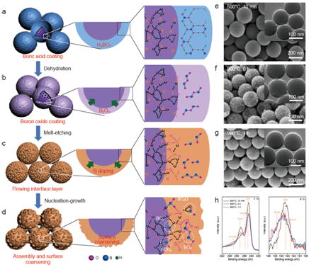 此外,这种独特的策略显示出精确的可控制性和多功能性,使组装体具有可调的互连尺寸,表面粗糙度和可切换的组装单元。通过对硼掺杂种类的详细分析和一系列对比实验,研究团队提出了一种熔融刻蚀和成核生长机理来阐明硼掺杂组装的形成过程,这为互连组装技术的发展提供了新的策略。