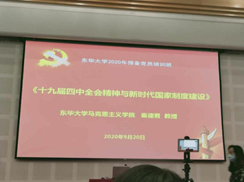 之后,秦德君教授向新党员讲授十九届四中全会的建设。他强调了“新时代”,由此指出学习十九届四中全会建设的重要性。之后秦德君教授讲解了十九届四中全会的基本精神,并对每一条文本都进行了详细而生动的讲解和举例,使学员们对十九届四中全会推进制度建设的学习更加记忆深刻。