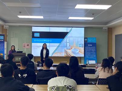 首先,通过视频放映的形式以及利健文总监ppt讲解的形式介绍了雷帝(中国)建筑材料有限公司的情况、公司的性质、发展历史、运营模式以及公司产品的应用价值和应用方向。之后,陆佳敏总监对雷帝公司的企业文化、使命、愿景及核心价值观做了详细的说明,后续的应届生人才培养方式的讲述更激起了同学们极大的兴趣。紧接着,陆佳敏总监邀请就职于雷帝公司的东华校友分享就职体验与感想,介绍工作心得、岗位内容以及公司部分产品概况,旨在吸引即将毕业的“新鲜血液”。在现场答疑环节,陆佳敏总监对同学提出的“试用期薪资”、“毕业生落户政策”、“是否会存在加班,加班薪资发放”、“后续面试安排”“岗位晋升”等问题进行详细解答,帮助同学更深入的了解公司内部机制和运营模式。