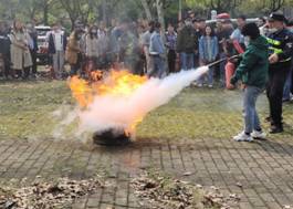 最后材料学院师生在保卫处老师及保安队工作人员的指导下,在室外进行大规模实地灭火规范操练,200余名师生逐个受到指导,进行了安全地灭火实训实地演练。