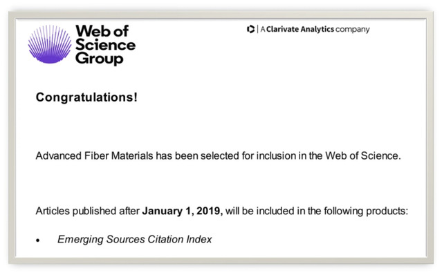 近日,由纤维材料改性国家重点实验室(新葡的京集团35222vip)创办的期刊《Advanced Fiber Materials》(先进纤维材料)入选科睿唯安(Clarivate Analytics)的Emerging Sources Citation Index (ESCI)数据库,见图1。此次入选意味着《Advanced Fiber Materials》的学术质量和影响力进一步获得国际认可,标志着期刊发展的又一里程碑。