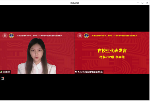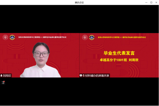 毕业典礼上,卓越高分子1801班刘雨欣、材料193硕周大旺分别作为毕业生代表发言。刘雨欣同学讲述了自己的大学四年由稚嫩变得更加自信、果断、踏实、坚定的成长蜕变,倡议同学们以德行为立人之本,以学识为发展之根,磨炼意志,求真务实,发扬“崇德博学,砺志尚实”的校训精神,以“东华青年”之名扬帆起航。周大旺同学在发言中表达了对母校和母院的感谢。从入学之初提供优化的课程体系和完整的实验设备,资助科研立项,组织学科交流,到读研期间导师以身作则、悉心栽培,再到毕业季搭建宽阔的就业平台以及严峻的疫情防控攻坚战中向春季毕业生们伸出温暖臂膀,学校和学院无时无刻的关心指导让他内心充满感动。他希望全体毕业生用求真务实,脚踏实地的态度实现人生理想,用成长和成才继续展现东华材料人的风采。材料212硕杨雨箫同学作为在校生代表发言。她感到,毕业生们严谨求知的学习精神、乐观向上的处事风格、求真务实的科学态度为全体在校生留下了宝贵的精神财富,她代表在校生立志以优秀的毕业生们为榜样,刻苦学习,脚踏实地,努力钻研,勇于创新,争取早日成才,肩负起为母校争光、为国家效力的重任,用青春和智慧续写辉煌的篇章。