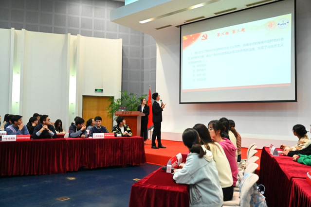 比赛现场,入围的八个学生党支部代表队通过“有问必答”“抢占先机”两大环节角逐最终名次。参赛选手们充分运用自身知识储备,“见招拆招”快问快答,争先抢夺答题机会,上演了一场知识与速度的精彩较量,充分展示了学习党的二十大精神的阶段性成果。