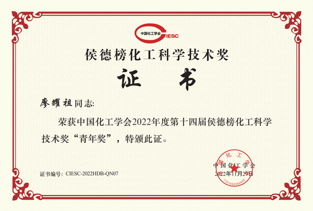 近日,中国化工学会在北京召开了第四十一次会员代表大会。大会公布了2022年度第十四届“侯德榜化工科学技术奖”的获奖名单。材料学院廖耀祖教授荣获第十四届侯德榜化工科学技术奖“青年奖”。