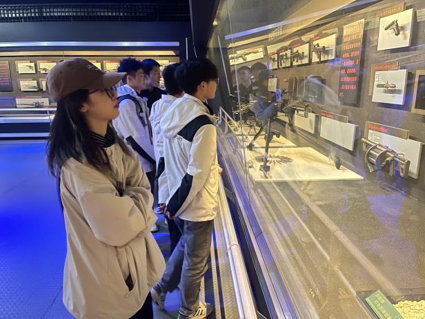 (退役大学生士兵曹聪在重兵器陈列馆向同学们介绍“迫击炮”)