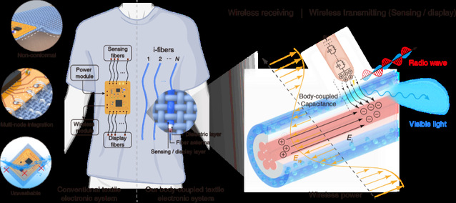 随着科技不断发展,智能可穿戴设备正逐渐成为我们生活的一部分,并在健康监测、远程医疗和人机交互等领域发挥着越来越重要的作用。相较于传统刚性半导体元件或柔性薄膜器件等,由智能纤维编织而成的电子纺织品具有更好的透气性和柔软度,被视为理想的可穿戴设备载体。目前,智能纤维的开发多基于“冯·诺依曼架构”,即以硅基芯片作为信息处理核心开发各种电子纤维功能模块,如信号采集的传感纤维、信号传输的导电纤维、信息显示的发光纤维、能量供应的发电纤维等。尽管这些功能单元可组合制成织物形态,但这种复杂的多模块集成技术还面临着一系列挑战。现阶段的智能纺织品仍依赖于芯片和电池,体积、重量和刚性大,难以同时满足人们对纺织品功能性和舒适性的需求。