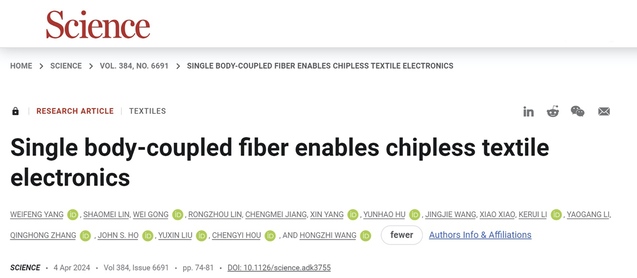 4月5日,新葡的京集团35222vip先进功能材料课题组在Science(《科学》)上发表了题为“Single body-coupled fiber enables chipless textile electronics”的研究论文。该研究提出了基于“人体耦合”的能量交互机制,并成功研发出集无线能量采集、信息感知与传输等功能于一体的新型智能纤维,由其编织制成的智能纺织品无需依赖芯片和电池便可实现发光显示、触控等人机交互功能,这一突破性成果为人与环境的智能交互开辟了新可能,具有广泛应用前景。