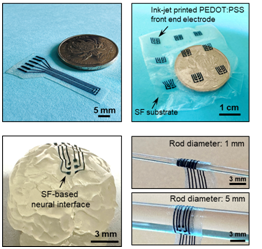 进一步地,基于热温辅助图案转移技术,研究人员成功地将喷墨打印的PEDOT电极转移至SF柔性衬底,并制得了具有6电极通道的非瞬态SF柔性神经接口(图3)。“神经接口器件前端采集点尺寸越小,所采得脑电信号越精确,此外,更小的器件尺寸也利于缩小植入创面”,论文第一作者博士生胡展翱说:“相较于现有SF基神经电极/接口材料,我们制备的SF柔性神经接在共形性、水稳定性和更小电极尺寸方面均具有较为明显的优势”。