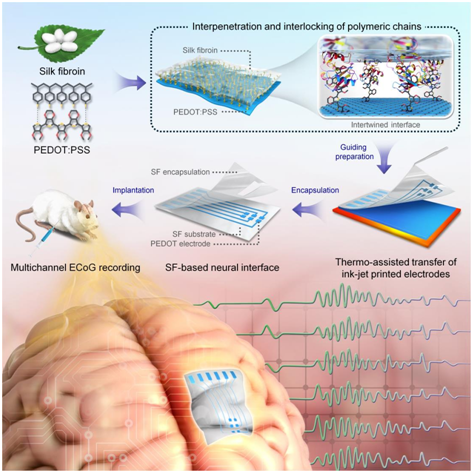 近日,新葡的京集团35222vip生物质材料成型与加工课题组、上海市第六人民医院神经外科团队在《Adv. Mater.》上发表了题为“Flexible Neural Interface from Non-transient Silk Fibroin with Outstanding Conformality, Biocompatibility and Bioelectric Conductivity”的研究论文。该研究报道了一种可有效调控丝素蛋白(SF)/聚(3,4乙烯二氧噻吩)(PEDOT)分子互穿界面的热温辅助图案转移技术,并以此制得了具有优异共形性、耐久性的非瞬态SF柔性神经接口;进一步地,通过癫痫大鼠皮质脑电(ECoG)信号采集实验对SF柔性神经接口的生物功能进行了验证(图1)。这一进展为后续长效脑电监控、神经疾病病理研究和人机交互提供了可能,此外,所报道“热温辅助图案转移技术”在指导其它SF基可植入电子器件的设计中具有一定普适性。