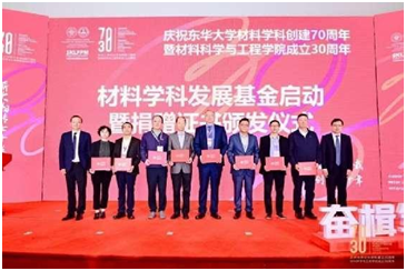 大会还举行了讲席教授、杰出贡献奖授予仪式,材料学科发展基金启动暨捐赠证书颁发仪式。项延训为杰出贡献奖获得者顾利霞、胡学超、陈彦模、刘兆峰、王依民颁奖,耿绍宁为郁铭芳基金讲席教授陈惠芳、王华平、胡祖明,爱博基金讲席教授李光、李耀刚颁奖。赵震、材料学院党委书记李斌荣共同启动材料学科发展基金,并为华峰化学股份有限公司、东方国际(集团)有限公司、上海诺毅投资管理集团有限公司、爱博诺德(北京)医疗科技股份有限公司、中国化学纤维工业协会、浙江恒逸集团有限公司、厦门当盛新材料有限公司、上海水星家用纺织品股份有限公司等企业代表颁发捐赠证书。