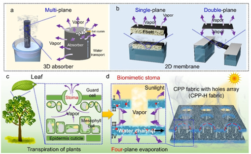 随后,将CPP-H织物斜挂在高海水槽和低空槽之间,组装成向光斜挂蒸发器。高水槽的海水会渗透织物边缘,沿着斜挂织物的底层和顶层流动,实现了从高海水槽向低空槽的海水传输。阳光照射下,织物吸收太阳光并将其转化为热,促使海水在顶层的上表面(平面I)、顶层的下表面(平面II)、底层的上表面(平面III)和底层的下表面(平面IV)四个平面同步蒸发(图1d, 图3)。其中,外平面(I和IV)的蒸汽可直接扩散至大气中,而内平面(II和III)的蒸汽则沿中间层传输,并通过顶层孔阵列扩散至外部环境。CPP-H织物的蒸发模式模拟了植物叶片的蒸腾过程。蒸发后剩余的海水被浓缩为盐水,并滴落至低空收集槽,从而有效避免蒸发器内部盐结晶积累。实验结果表明,该三层光热织物在1.0 kW m-2光照下蒸发速率可达2.6 kg m-2 h-1,性能优于基于类似材料的传统漂浮模型(单平面蒸发,1.6 kg m-2h-1)、单层织物悬挂模型(双平面蒸发,1.9 kg m-2h-1)或三层织物(四平面蒸发无蒸汽通道,2.2 kg m-2h-1)(图3)。