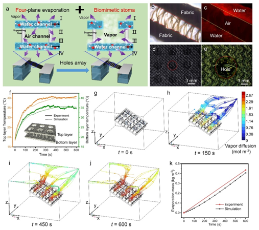 研究团队模拟了CPP-H织物中蒸汽的生成及其通过顶层孔阵列扩散的过程(图4)。为直观展现孔阵列的增量效应,蒸汽扩散路径被可视化,并通过颜色深浅映射蒸汽浓度分布。结果显示,平面II和III的有效蒸发作用使中间层的蒸汽摩尔浓度迅速上升,随后蒸汽通过顶层孔阵列自发扩散至蒸汽浓度较低的外部环境。